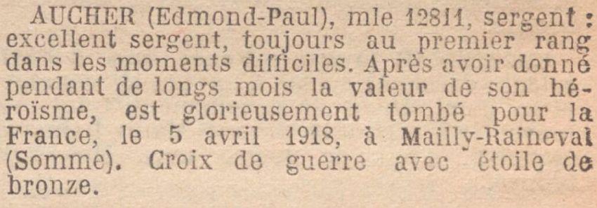 Cité à l'ordre du régiment N° 258 'Excellent sous-officier au front depuis le début de la Campagne; s'est particulièrement fait remarquer par son sang-froid et sa ténacité le 7 avril 1916. Blessé en cette circonstance'.