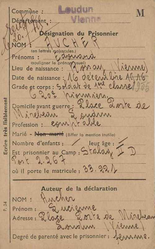 Soldat au 620e Pionniers Prisonnier de guerre : Stalag II D Post 2267 Matricule 33221 - Rentré le 20 juillet 1945. Résidence : Place porte de Mirebeau - Loudun