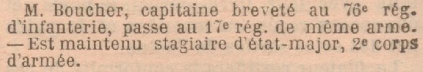 Détaché comme stagiaire à l'E.M. du 2e corps d'armée au 17e Régiment d'Infanterie le 5 Avril 1898.