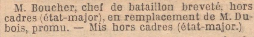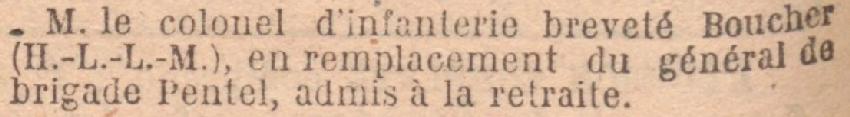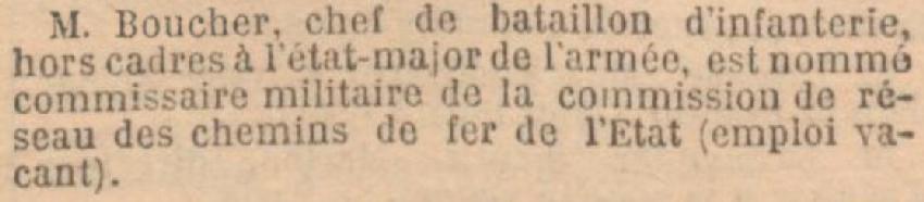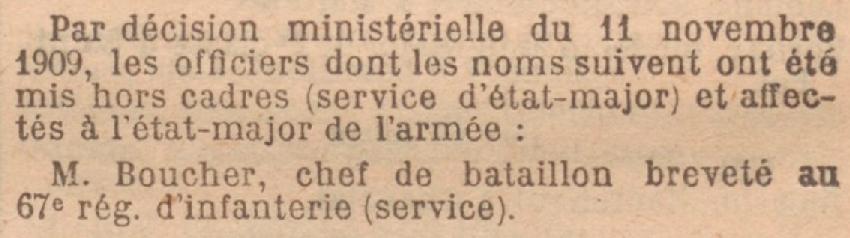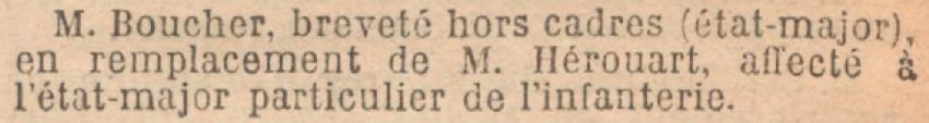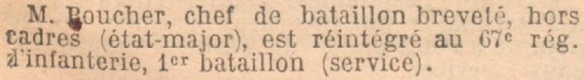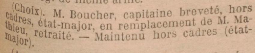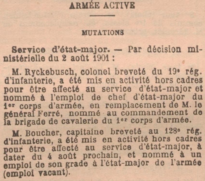 Mis en activité hors cadres et nommé à un emploi de son grade à l'État Major de l'Armée (1er Bureau) le 2 Août 1901.