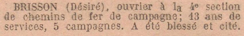 Cité à l'ordre de la 28e Brigade le 2 Septembre 1915 N° 52 : 'Soldat très brave, a executé volontairement plusieurs patrouilles pour reconnaître les lignes enemies le 24 août 1916, a été grièvement blessé à son poste de guetteur dans ne tranchée soumise à un violent bombardement'.