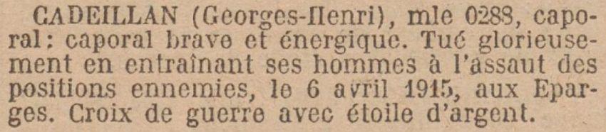 Décédé le 6 avril 1915, sur le champ de bataille des Éparges, des suites de blessures de guerre (Acte de décès N° 341. Avis Officiel N° BG 2391 du 1er Mai 1915.