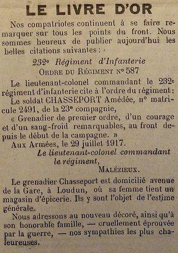 Citation : 'Cité à l'ordre du Régiment N° 587 du 29 janvier 1917. 'Grenadier de premier ordre, d'un courage et d'un sang-froid remarquables au front depuis le début de la campagne.