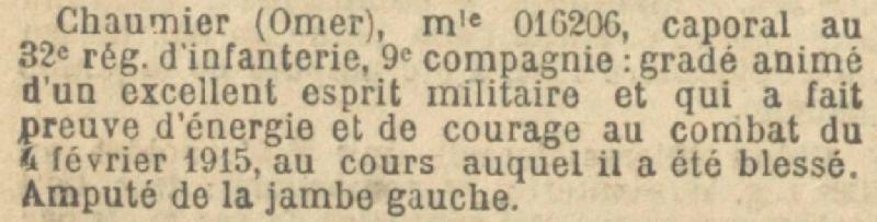 Médaille Militaire pour prendre rang du 20 Septembre 1915 (Décision Ministérielle du 8 Octobre 1915) avec ce motif 'Gradé animé d'un excellent esprit militaire et qui a fit preuve d'énergie et de courage au combat du 4 Février 1915 au cours duquel il a été blessé (Amputé de la jambe gauche).