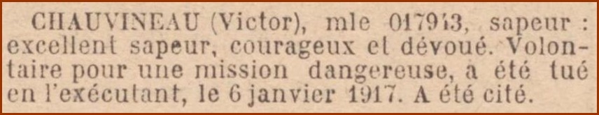 A m'ordre de la Division du 31 Janvier 1917 (Ordre N° 107 du Général Commandant la 19e Division) "Excellent sapeur, brave et travailleur. A été tué en travaillant à une position soumise à un violent bombardement".