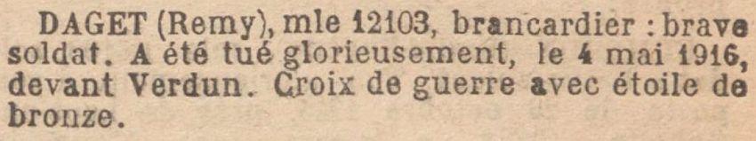 Tué à l'ennemi le 4 Mai 1916 côte 304 Mort Homme. Avis officiel n° 5963 FO du 29 Mai 1916.