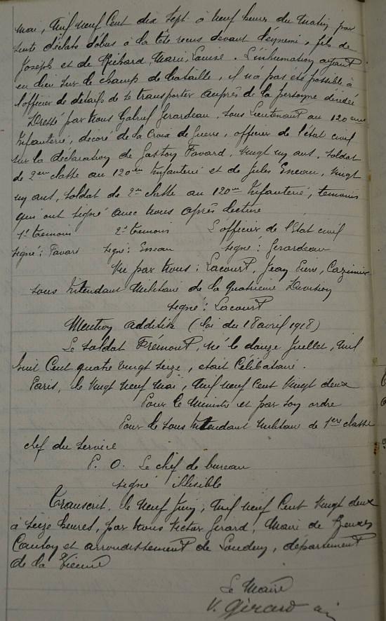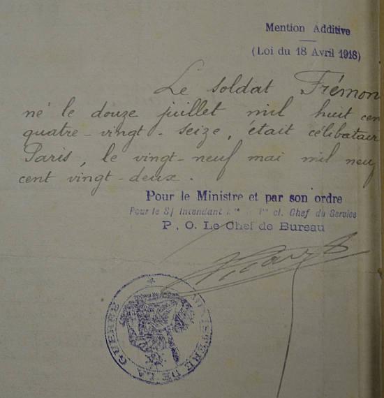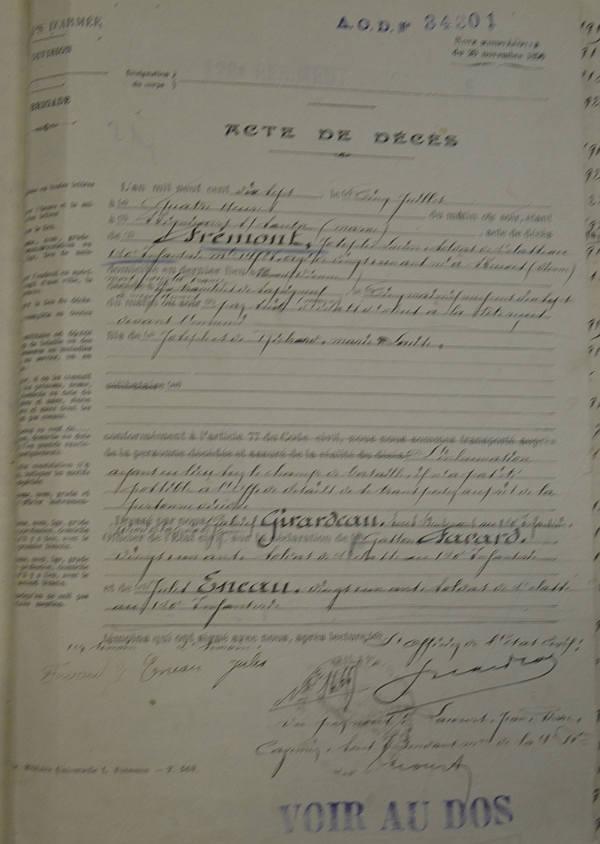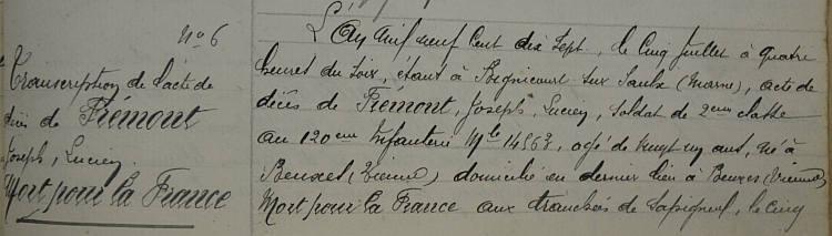 Tué à l'ennemi le 5 Mai 1917 aux tranchées de Sapigneul (Marne) par éclats d'obus. Avis Ministériel du 6 août 1917 ADN N° 9678.