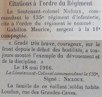 Cité à l'ordre du Régiment n° 119 du 18 Mars 1916 'Gradé très brave, courageux, sur le front depuis le début des hostilités, a toujours montré l'exemple du dévouement et de la discipline'.