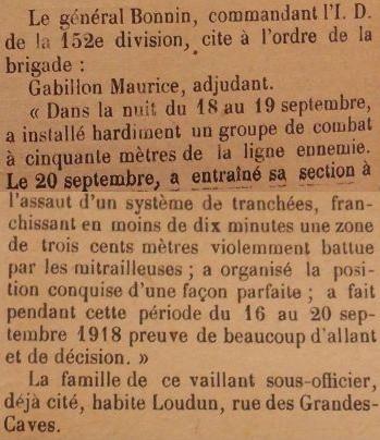 Cité à l'ordre de la brigade n° 87 du 17 Novembre 1918 'Dans la nuit du 18 au 19 septembre a installé hardiment un groupe de combat à 50 mètres de la ligne ennemie. Le 20 Septembre a entraîné sa section à l'assaut d'un système de tranchées, franchissant en moins de 10 minutes une zone de 300 mètres violemment battue par les mitrailleuses, a organisé la position conquise d'une façon parfaite et fait preuve pendant cette période du 16 au 20 Septembre 1918 de beacoup d'allant et de décision'.
