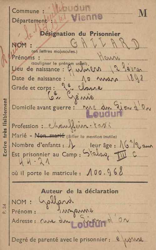 Prisonnier de guerre : Stalag XIII C 44-21 - Matricule 100968 - Rentré le 15 juillet 1941.