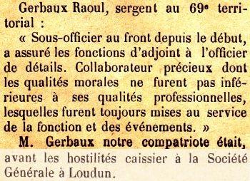 A l'ordre du Bataillon N° 11 du 15 Janvier 1919. "Sous officier au front depuis le début a assuré les fonctions d'adjudant à l'officier des détails, collaborateur précieux dont les qualités morales ne furent pas inférieurs à ses qualités professionnelles lesquelles furent toujours mises au service de la fonction et des évènements".