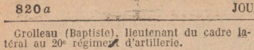 Promu Lieutenant de réserve par Décret Présidentiel en date du 20 Novembre 1922 rang du 28 Mai 1918 et par Décision Ministérielle du même jour maintenu au 20e RAC (J.O. du 25 Novembre 1922).