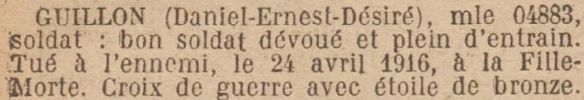 Tué à l'ennemi le 26 Avril 1916 à la Fille Morte (Avis Ministériel 2474 . 2265 FM du 7 Mai 1916.