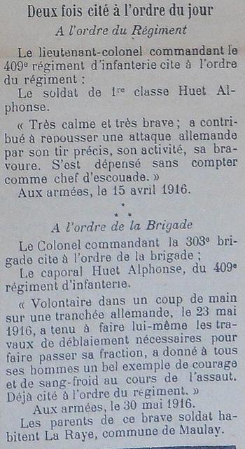 Cité à l'ordre de la 303e Brigade N° 230 le 31 mai 1916 'Volontaire dans un coup de main sur ne tranchée ennemi le 23 mai 1916 a tenu à faire lui mùeme les travaux de déblaiement nécessaires pour faire passer sa fraction a donné à tous ses hommes n bel exemple de corage et de sang froid au sours de l'assaut'. Déjà cité à l'ordre du régiment.