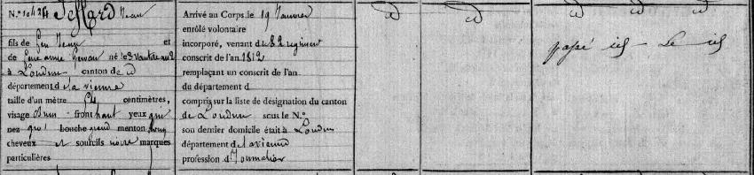 Conscrit de l'an 1812. Entré au Service dans le 82e régiment le 22 Novembre 1813. Incorporé au 113e Régiment d'infanterie de Ligne, venant du 82e Régiment. Fusilier au 4e Bataillon, 4e Compagnie. Passé au 121e Régiment de Ligne le 12 Février 1814.