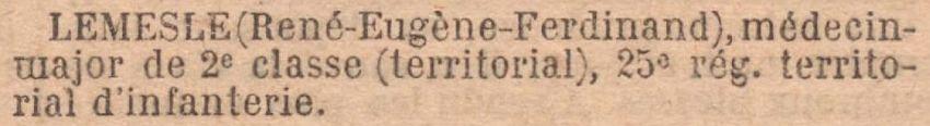Promu Médecin aide Major de 1ère classe de l'Armée Territoriale par décret du 17 Juillet 1908.