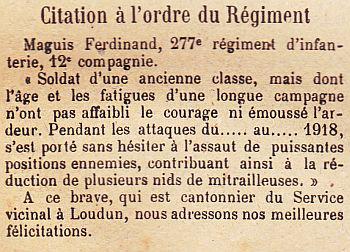 Ordre du Régiment n° 338 du 12 Septembre 1918 :"Soldat d'une ancienne classe, mais dont l'âge et les fatigues d'une longue campagne, n'ont pas affaibli le courage ni émoussé l'ardeur. Pendant les attaques du 28 Août au 2 septembre 1918, s'est porté sans hésiter à l'assaut de puissantes positions ennemies, contribuant ainsi à la réduction de plusieurs nids de mitrailleuses".