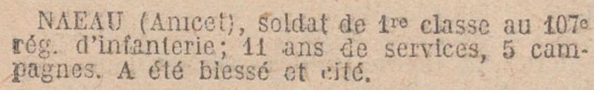 Cité à l'ordre du Régiment n° 305 du 1er août 1916 'Soldat modèle a toujours fait preuve d'un sentiment élevé du devoir a été blessé le 23 août, le 24 janvier 1915 et le 24 mai 1916'.