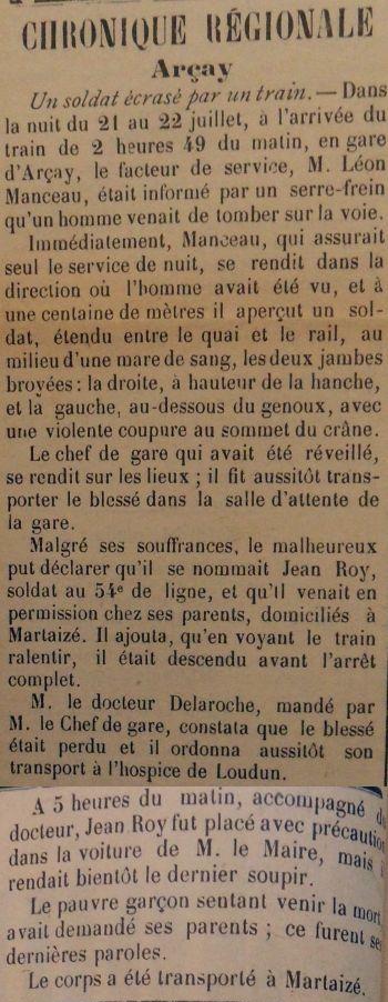 Décédé le 22 Juillet 1917 à Arçay (Vienne) par accident de chemin de fer. Avis Ministériel HZ 320 le 5 février 1918.