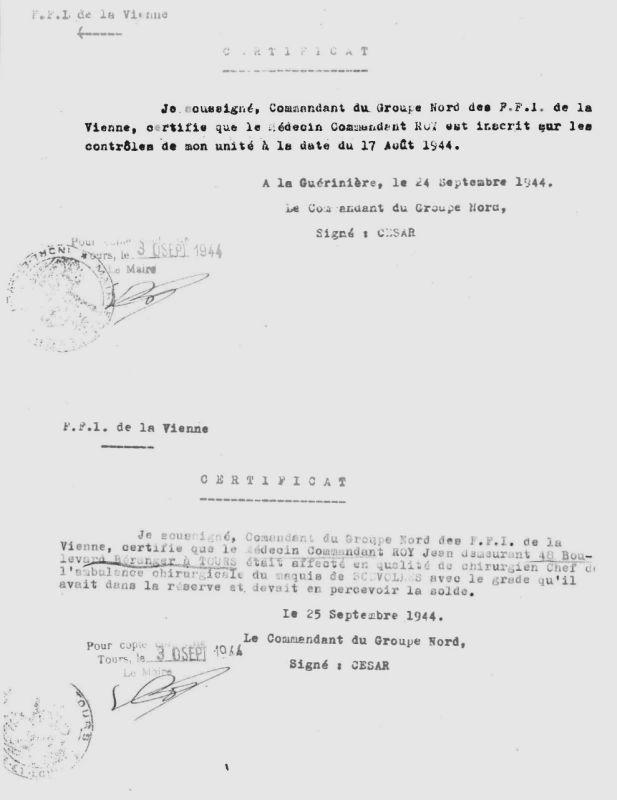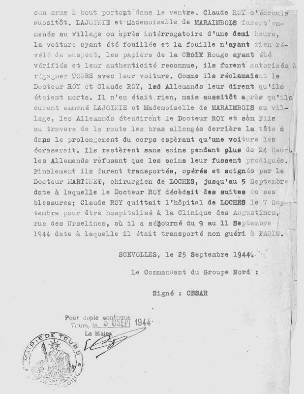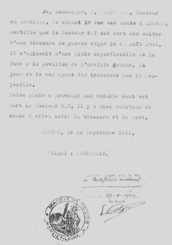 A la fin de la guerre, sa mère recevra une lettre, adressée à son mari par le médecin allemand qui l'avait fait libérer de la prison de Tours ; emprisonné à son tour, il le sollicite pour qu'il le fasse libérer en témoignant de ce qu'il avait fait pour lui. Il ignore que le docteur Roy est décédé à cette date. Sa mère interviendra... mais il ne sait pas si cela aura ou non une quelconque utilité.