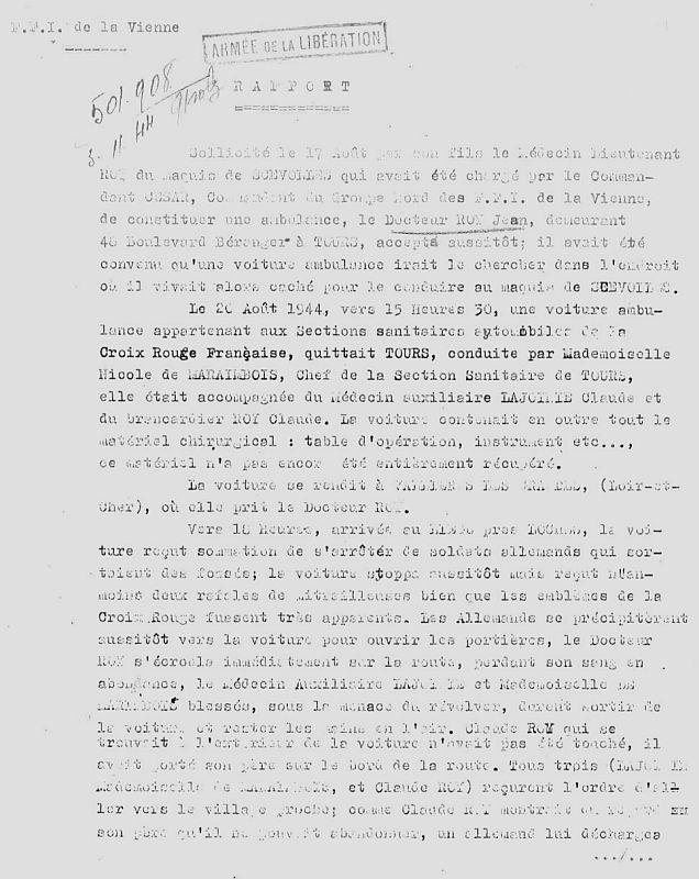 Jean Roy se cache dans un premier temps à Vallières les Grandes (Loir et Cher), un village proche de Montrichard. Pendant ce temps l'un de ses fils, également prénommé Jean, a rejoint Scévolles et a contacté son père pour qu'il le rejoigne et vienne soigner les blessés. Il approche alors un ancien médecin militaire pour obtenir une ambulance et se charge de trouver du matériel médical "emprunté" aux Allemands ! Ils partent ainsi le 20 août 1944 accompagnés d'une infirmière, Nicole de Maraimbois, qui conduit le véhicule, d'un étudiant en médecine, Claude Lajoinie et d'un autre fils, Claude, âgé de 16 ans, qui fait le guet sur l'aile de la voiture pour prévenir d'éventuelles attaques aériennes ennemies... ou alliées !