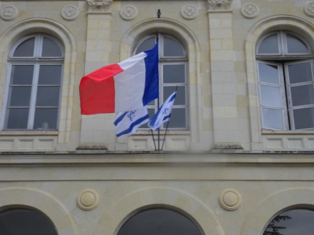 Fronton de l'hôtel de Ville de Loudun paré des drapeaux français et irraëliens