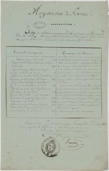 Ans 7 & 8 à Naples, Italie, ans 9 & 10, 11, 12 embarqué à Toulon, 14, Vendemiaire 1806 à xxxxx en xxxxx & Valois, Italie et Dalmatie, 1807 & 1808 en Dalmatie + 1812 & partie de 1813 en Russie, 1813 en Saxe & 1814 en France.