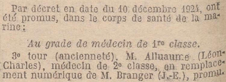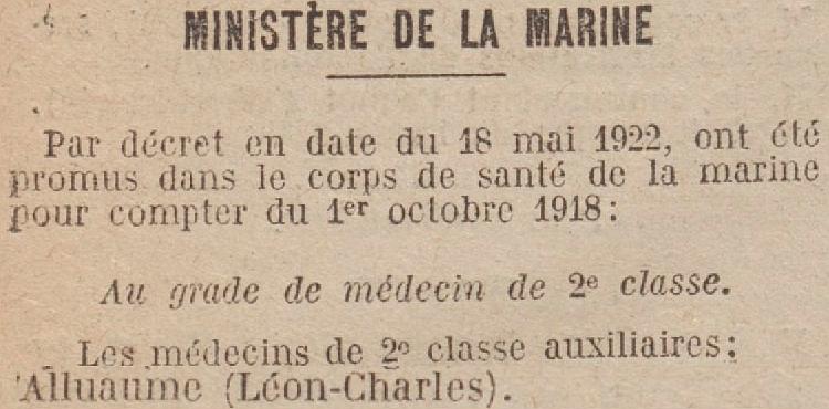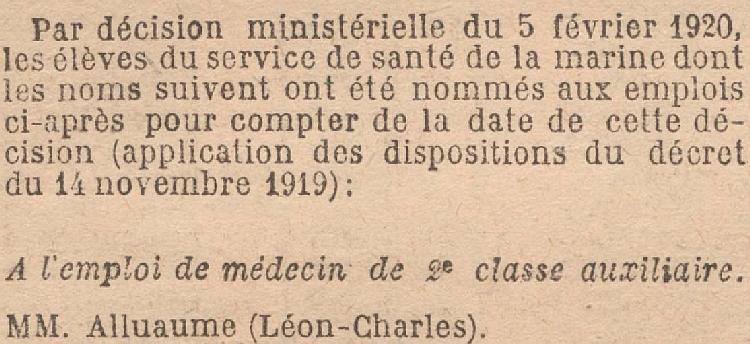 Médecin de 2e clase auxiliaire le 5 Février 1920.École d'application du service de santé de la marine à Toulon le 1er Janvier 1922.