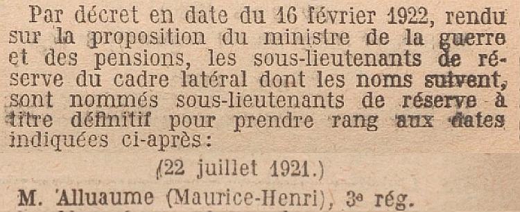 Promu sous-Lieutenant de Réserve à titre définitif JO du 21 février 1922 rang du 22 Juillet 1921.