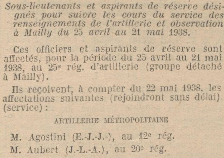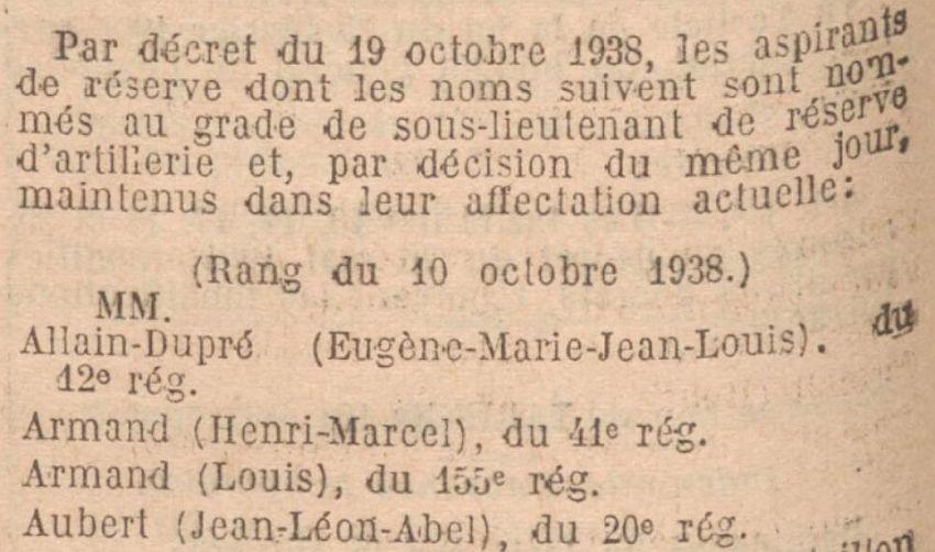 Nommé Aspirant de réserve rang du 10 avril 1938 et passé le dit jour au 25e Régiment d'Artillerie. Décret du 28 mars 1938 - Journal Officiel du 15 avril 1938).