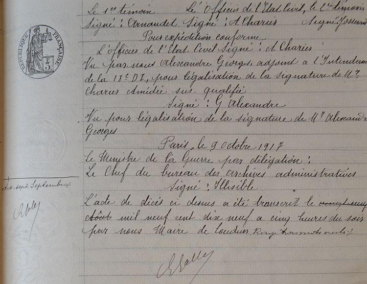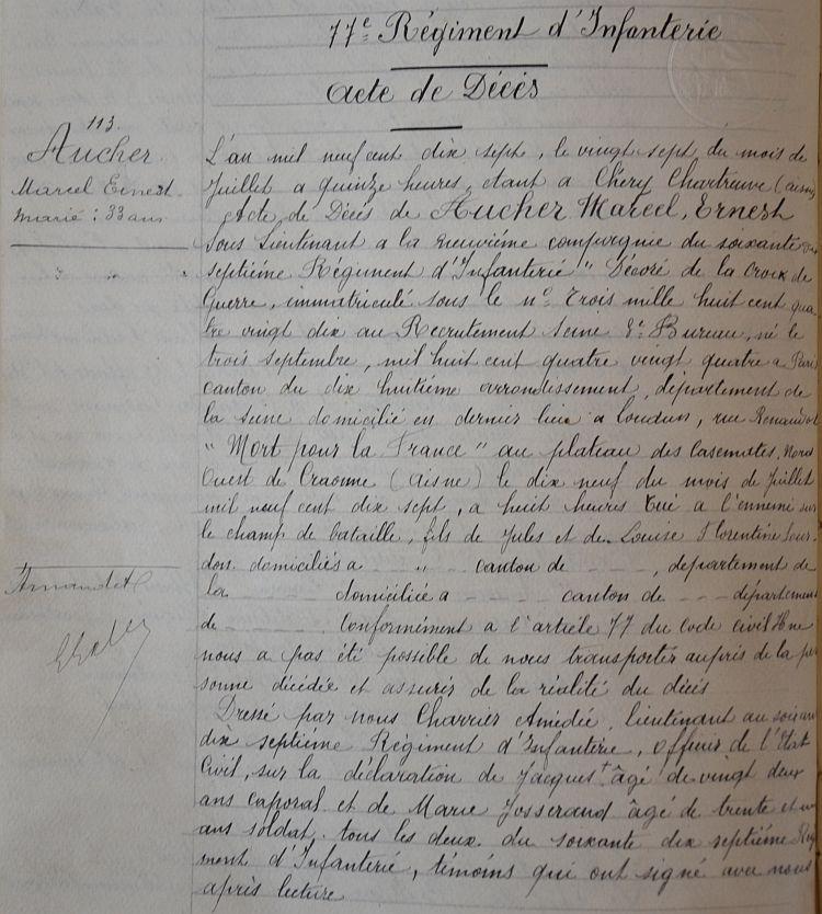 Nommé SLieutenant de réserve et affecté au 77e R.I. le 9 Mars 1917. Télégramme N 1238 de la 9e Région au 7 Mars 1917.