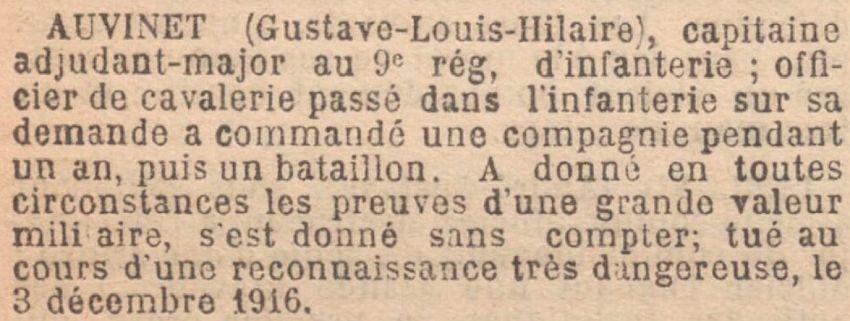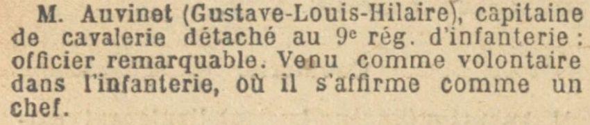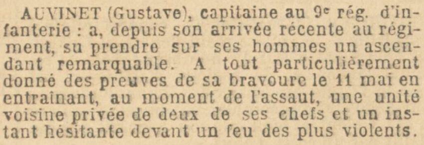 Cité à l'ordre de l'armée (J.O. du 15 août 1915) : 'A, depuis son arrivée récente au régiment, su prendre sur ses hommes un ascendant remarquable. A tout particulièrement donné des preuves de sa bravoure le 11 mai, en entraînant au moment de l'assaut, une unité voisine privée de 2 de ses chefs et un instant hésitante devant un feu des plus violents."