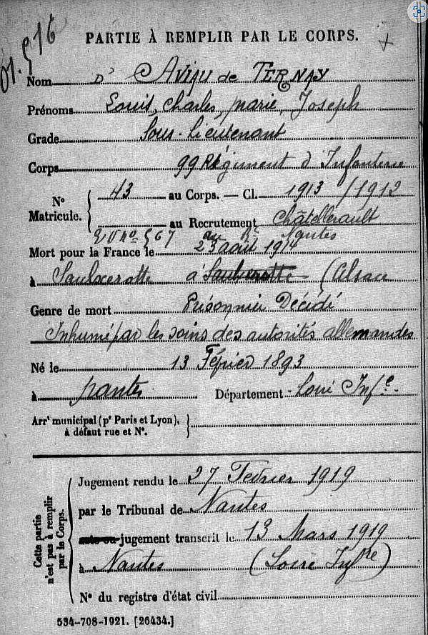 Nantes 13 Février 1893 - Saulxures 23 Août 1914 Sous-Lieutenant