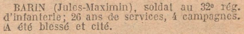 Citation Ordre du Régiment 96 N° 219 du 8 Octobre 1917 : Courageux et brave a été plusieurs fois blessé à son poste de combat.