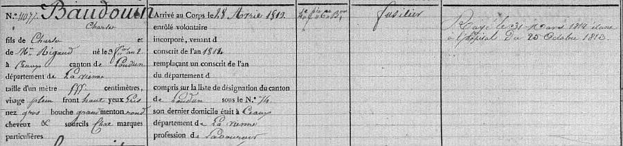 Conscrit de l'an 1814. Arrivé au Corps le 28 Avril 1813. 4e Compagnie - 6e Bataillon. Fusilier. Rayé le 31 Mars 1814 étant à l'Hôpital du 25 Octobre 1813.