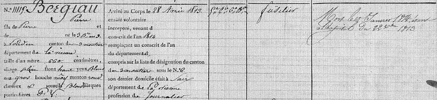 Conscrit de l'an 1814. Fusilier au 70e régiment d'infanterie de ligne, 5e Compagnie 6e Bataillon. Arrivé au corps le 28 Avril 1813. Mort le 10 Janvier 1814, étant à l'hôpital militaire Kornboden du 22 Décembre 1313. Dernier Domicile : Saix.