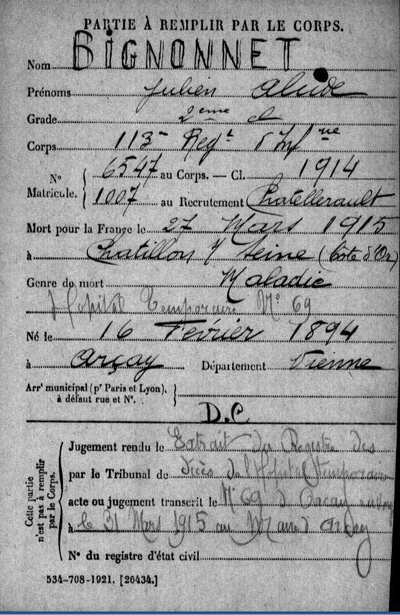 Décédé de maladie le 27 mars 1915 à l'hôpital N° 69 de Châtillon-sur-Seine.