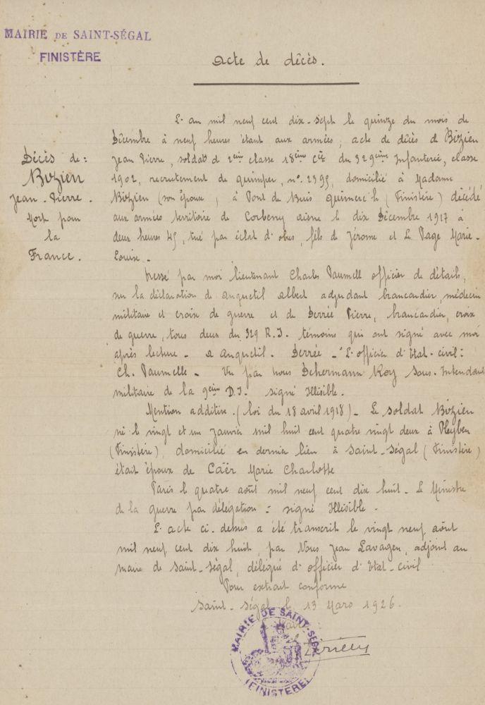 Dirigé sur le 118e Régiment d'Infanterie le 20 Août 1917.