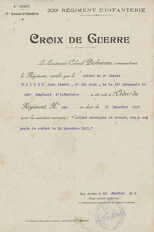 Parti aux armées au 283e Régiment Territorial d'Infanterie et affecté par le D.D. de la 158e D.I. au 129e (329e) Régiment d'Infanterie le 25 Août 1917.