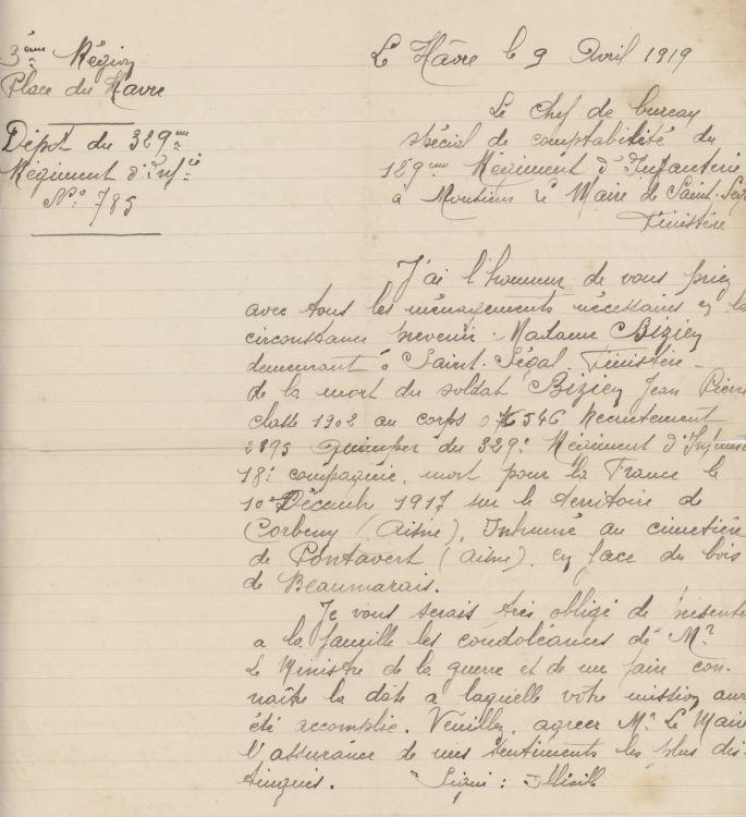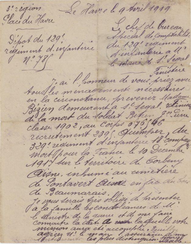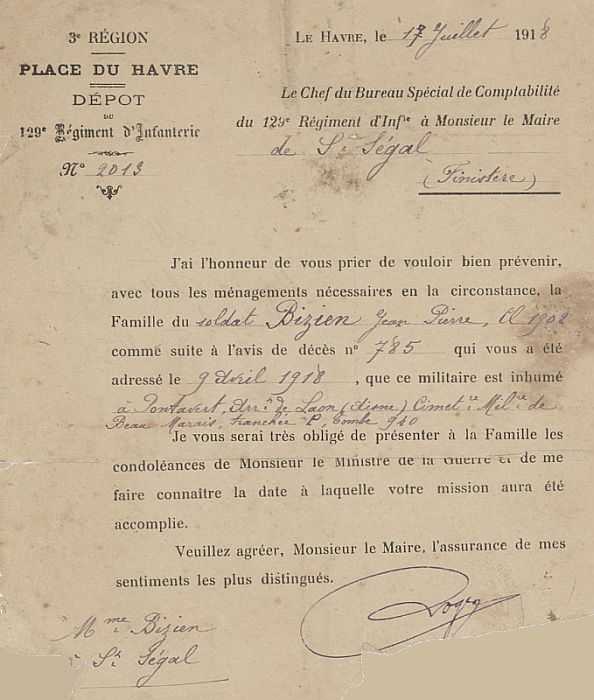 Tué par éclat d'obus au bois de l'enclume le 10 Décembre 1917, territoire de Corbeny (Aisne) avis du Ministère de la guerre.
