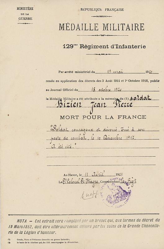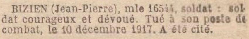 Cité à l'ordre du régiment n° 382 du 31-12-1917 'Soldat courageux et dévoué, tué à son poste de combat le 10 Décembre 1917'.