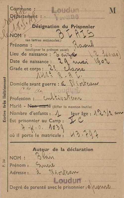 Prisonnier de guerre : Stalag X C - AKO 1039 - Matricule 43797 - Rentré le 18 mai 1945