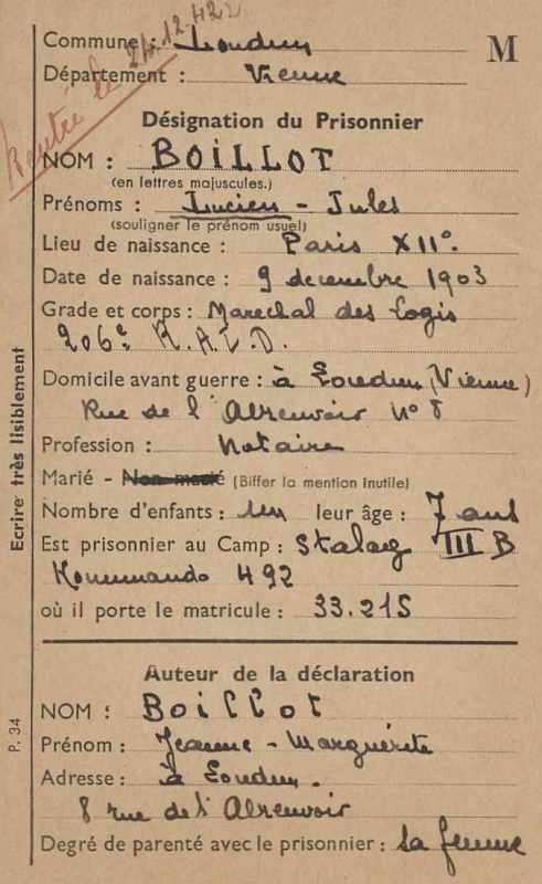 Prisonnier de guerre : Stalag IIIB Kommando 492 - Matricule 33215 - Rentré le 24 décembre 1942.