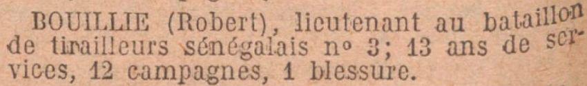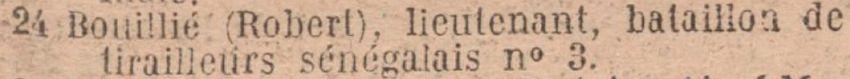 Cité à l'ordre des Troupes du Groupe de l'Afrique Occidentale Française (ordre n° 19 du Général Commandant supérieur des Troupes de l'Afrique Occidentale Française du 14 Août 1928.