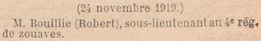 Nommé sous-Lieutenant à Titre Définitif Active (Décret du 18 février 1919) (Journal Officiel du 21 février 1919).