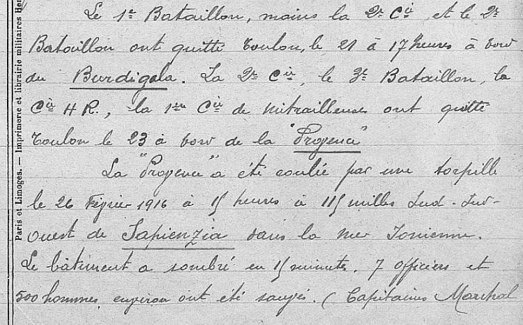 Disparu le 26 février 1916 à bord de la Provence II. Présumé décédé (avis du Ministère de la Guerre, Bureau des archives administratives du 14 juin 1916).