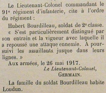 Cité à l'ordre du Régiment N° 267 du 26 Mai 1917 'S'est particulièrement distingué par son entrain et la vigueur avec laquelle il a repoussé une attaque ennemie. A poursuivi les assaillants jusque dans leurs lignes'.