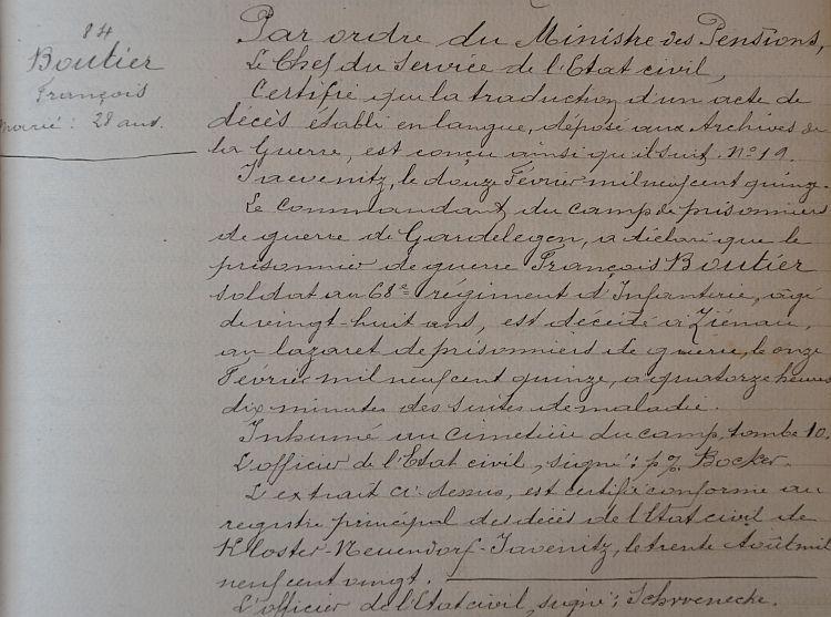 Décédé le 11 Février 1915 au camp de prisonniers de Gardelengen (suite de blessures de guerre).