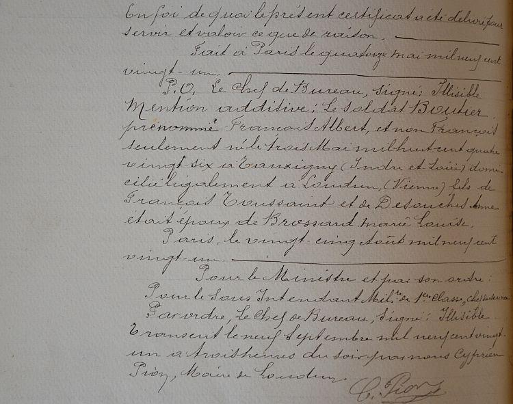 Classé dans l'affectation spéciale, employé à le Compagnie de l'État comme homme d'équipe à Batignolles (4e Section de Chemin de fer subdivisions complémentaires) du 8 mars 1911 au 1er septembre 1914.