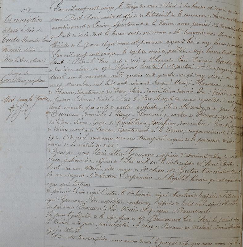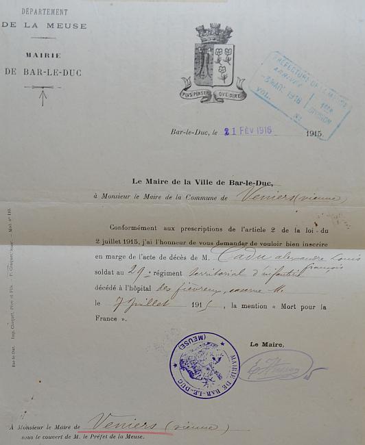 Décédé le 7 Juillet 1915 à l'Hôpital central de Bar-le-Duc (Maladie contractée eau cours des opérations de guerre). Buletin de l'Hôpital 46 du 7 Juillet 1915.